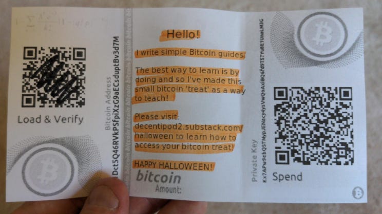 Okay, now we can transfer the funds from the āpaper walletā that you received as a Halloween treat into your own super secret bitcoin wallet. Remember: only you have the 12 word private key seed phrase so keep it safe. Scroll back up to the top for instructions how to receive the ābitcoin treatā into your new wallet. Enjoy the satoshis! š š„³