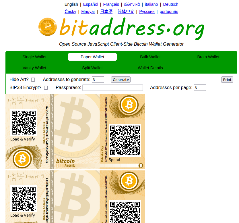 Once the counter reaches 100%, click the button that says Paper Wallet, and it will generate these slick looking paper wallets using all that randomized motion from your mouse. Each one of these ābillsā is actually a different bitcoin wallet. Even though it calls them addresses they are in fact completely different wallets with their own private keys. So a pile of these shouldnāt be left outside your front door, but it would be fine to hand them out one by one to each trick or treater. Probably want to wrap it around a bite size Snickers or something with a rubber band. āŗļø